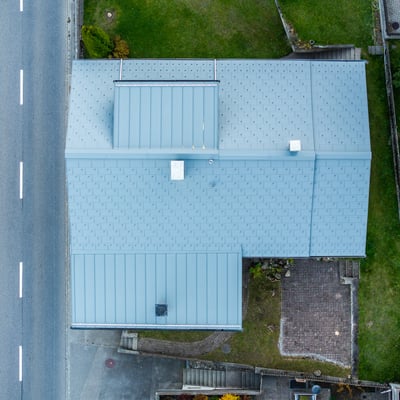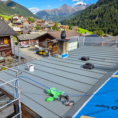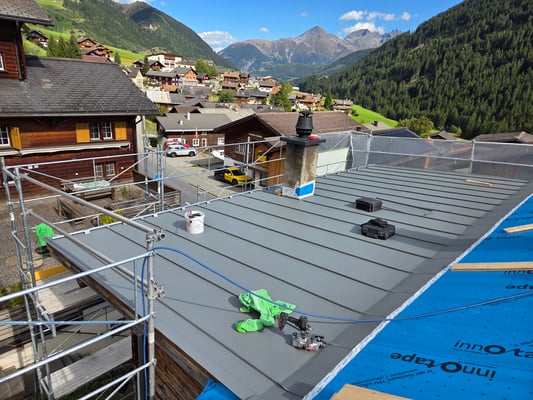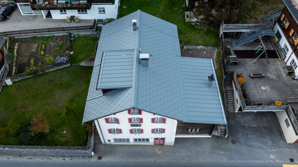Dieses Haus in Rueras hat ein neues Blechdach erhalten. Wir haben das bisherige Dach entfernt, neue Unterdachbahnen mit Prefa-Platten Installiert und komplett mit grauem Blech und Blechplatten neu eingedeckt. Ausserdem wurden die bereits bestehenden Gauben des Gebäudes neu verblecht. Die Lukarnendächer wurden im Stehfalzsystem ausgeführt.